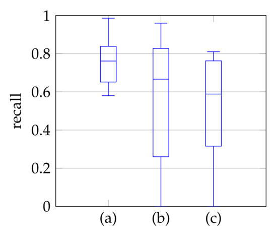 Recall of mitral valve detection over ten videos for Windowing (a), detection by Dukler et al. (b) and detection by Corinzia et al. (c).