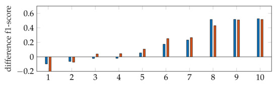 Ascending ordered difference of the f1-score for 10 videos: f1-score of segmentation with windowing subtracted by the f1-score of Dukler et al. (blue) and f1-score of segmentation with windowing subtracted by the f1-score of Corinzia et al. (red).