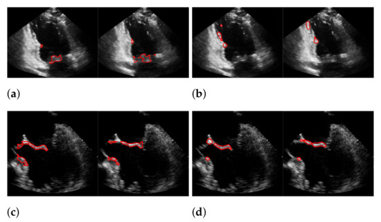In both figures (Figure 16 and Figure 18), the upper row of the segmentation by [9,40] gives an example of a missed mitral valve using a windowing technique and underlines the importance of correct valve detection. The upper row videos are especially challenging because of a partly disappearing mitral valve and weak contrast.