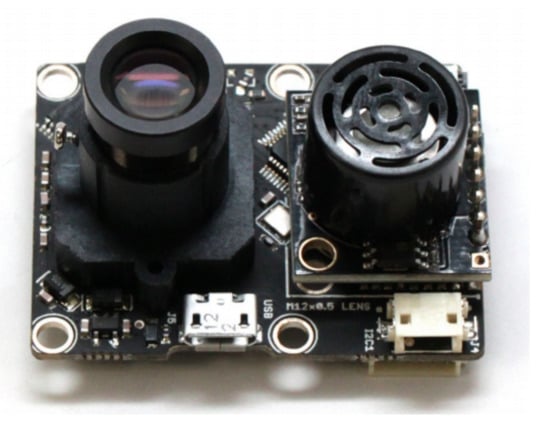 The PX4FLOW optical flow sensor with mounted lens on the left and ultrasonic sensor on the right [93].