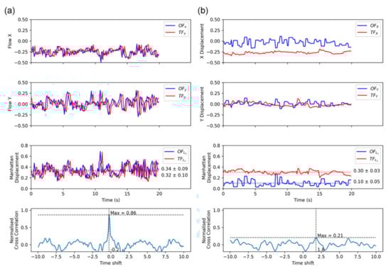 The results in Figure 6a show that thermal flow works comparatively well compared to optical flow in the X and Y directions. The third plot shows the Manhattan displacement for both, which show that the signals from OF and TF are closely matched. The fourth plot indicates a strong normalised cross correlation value of 0.86 showing the two signals represent the same phenomenon.