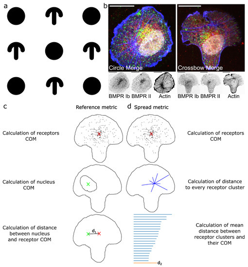 Outline of experiments and mode of operation of ComRed. (a): Scheme of circle and crossbow pattern. White background is passivated with PLL-PEG, while black regions are micropatterned using a photomask in a UV-ozone cleaner and coated with fibronectin (Section 4.1). Circle diameter is 50 µm. (b): examples of confocal microscopy images of HUVECs seeded on a circle (left) and crossbow micropattern (right). Green: BMPRIb, Red: BMPRII, Blue: actin, White: nucleus. Scale bars in all confocal images are 20 µm. (c,d): steps for the calculation of reference and spread metrics. For both metrics, first the center of mass of a receptor distribution is calculated. (c): For the reference metric, a reference point is taken, e.g., the center of mass of the nucleus. Afterwards, the distance between the two center of mass points is calculated. (d): For the spread metric, after determination of the center of mass of the receptor distribution, the distance to each single accumulation is calculated and the mean of these distances is taken.