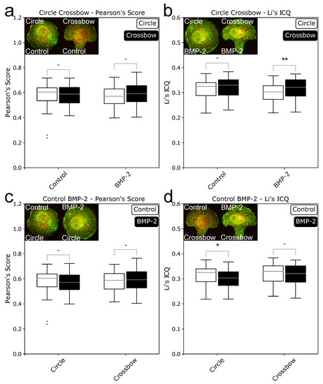 Boxplots of colocalization values of BMPRIb and BMPRII in HUVECs. (a,b): colocalization values of circle and crossbow cells +/− BMP-2, using Pearson’s score (a) and Li’s ICQ (b). c and d: colocalization values of control and BMP-2 induced cells in circle and crossbow cells, using Pearson’s score (c) and Li’s ICQ (d). Confocal images of HUVECs on circle- and crossbow-patterns were analyzed with the JaCoP imageJ extension [20]. Changes in colocalization between induced an noninduced cells indicated that the BMP-induced signaling complex is preferably used. No change in colocalization suggested that preformed complex is predominantly used. * = p < 0.05, ** = p < 0.01, - = not significant.