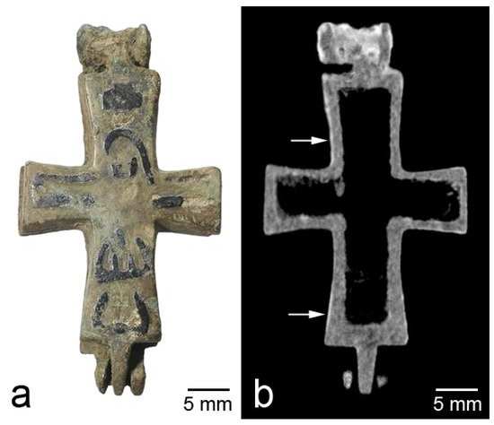 Photograph (a) and tomographic slice (b) of the cross from Fedosyino-1; arrows show areas of surface corrosion.