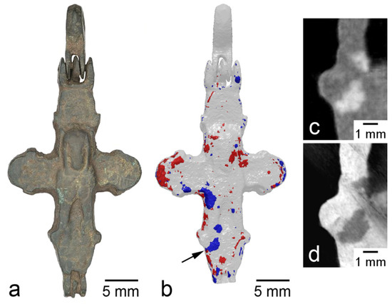 Corrosion is the main process that threatens the safety of metal archeological objects. As examples of the detection of corrosion, we refer the reader to tomographic studies of the reliquary cross pendants of the 11th–13th centuries, made by casting from tin–lead bronze [9,10]. These works were mainly aimed at studying the contents of the reliquaries, but the evaluation of the state of the metal was also part of the research task. Various cases were observed; as a rule, it was more or less homogeneous surface corrosion or inhomogeneous corrosion where volumetric areas of damage of the metal took place. An example of the first case is the cross from the rural site of Fedosyino-1 of Suzdal Land (Figure 1). Corrosion products are clearly visible in the tomographic slices as regions of high attenuation due to their content of hydrogen, which has a high thermal neutron attenuation cross-section.