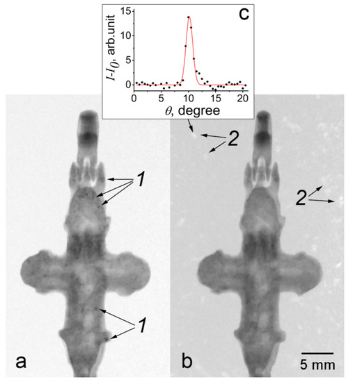 Inhomogeneous corrosion was observed in the cross from the rural site of Soroguzhino-2, Suzdal Land (Figure 2). It can be seen that the regions of corrosion are 1–5 mm in size and are more or less evenly distributed over the product (Figure 2b). A comparison of neutron and SR images shows that these regions have the opposite contrast; for SR, they are more transparent than metal, due to the fact that the density of the corrosion products is less than the density of the metal (Figure 2c,d). In the stacks of neutron projections of this cross, the diffraction effect of “flickering” is observed. The effect arises due to the strong attenuation of the neutron beam passing through small parts of the volume of the material in a narrow angular range of rotation of the object. This attenuation is due to the fact that, at a certain angular position, a single crystal grain of the metal enters the reflecting position, and a significant part of the beam intensity is removed from the image formation. This diffraction contrast was used, in a more complicated way, for the reconstruction of grain morphology in the polycrysrtalline materials [11]. This effect can also be detected in the following way: considering a sequence of projections in a certain range of angles (up to 20°), and using the ImageJ program function, one can construct a map of the minimum brightness values of these projections. Thus, the regions are distinguished for which the diffraction attenuation of brightness occurs in the given angular range (Figure 3a). These areas are the images of crystallites. The diffractive nature of the contrast in these images is confirmed by the map of maximum values for the same sequence of projections; diffraction reflections are observed in an empty field (Figure 3b). The reflections occur during the sample rotation angle of about 1.5° (full width at half maximum), as shown in Figure 3c. Thus, in the bronze cross with large crystallites of 1–1.5 mm in size, nonuniform internal corrosion is observed, whereas, in the crosses with small crystallites (less than the spatial resolution), surface corrosion is observed. Whether these phenomena are related is not yet clear.