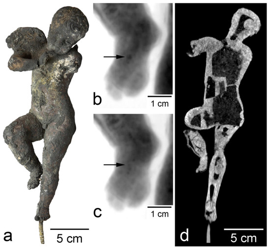Study of “Dancing Cupid” statuette: (a) photograph of the figurine; (b,c) neutron projections of a fragment of the statuette, obtained with a rotation of 2° (the arrow points to one of the grains); (d) tomographic slice.