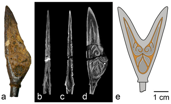 From the observed picture of the structure of the object and the diffraction data, it can be concluded that a dense layer of mill scale formed on the surface of the arrowhead in the funeral pyre. At temperatures above 575 °C, which corresponds to the temperature of the flame of a large bonfire, iron is oxidized to wustite FeO, which is further oxidized upon cooling, forming magnetite, and, on the outer surface, there is a small amount of hematite [15]. It is the layer of magnetite and hematite that has protective properties. Formation of a layer of scale on the arrowhead ensured its preservation until the moment of excavation, since all the metal was destroyed by corrosion, which led, in particular, to the formation of an internal cavity. Due to such preservation of the arrowhead, it was possible to find and to reconstruct the original appearance of the ornament (Figure 5d,e) [14].