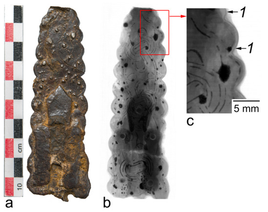 Study of the artifact from Chernaya Mogila: (a) photograph of the object; (b) SR radiograph; (c) enlarged part of the radiograph; 1—dense layer of mill scale.
