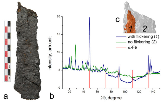 Detection of metallic iron in an artifact from Chernaya Mogila: (a) photograph of the object; (b) neutron diffraction pattern at two positions of the sample; the positions of the α-Fe lines are indicated; (c) reconstruction of the region of preservation of iron in the object.