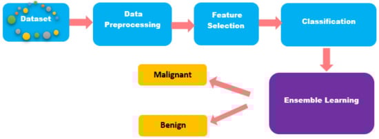 Nguyen et al. [3] used the WBCD Dataset to evaluate the performance of supervised and unsupervised breast cancer classification models. Scaling and principal component analysis were used for the selection of features, and they split the data into a 70:30 ratio for training and testing. They argued that the ensemble voting method is suitable as a prediction model for predicting breast cancer. After feature selection techniques, various models were tested and trained on the data. Among all the models used for the prediction, they stated that only four models, i.e., ensemble-voting classifier, logistic regression, support vector machine, and adaboost, provided approximately 90% accuracy. They reported the performance of the proposed model using accuracy, recall tests, ROC-AUC (receiver operating characteristic curve- area under the curve), F1-measure, and computational time.