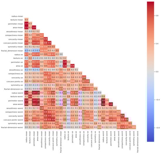 Dimensionality reduction is a technique to remove features that are less significant for predicting the outcome(s). In this work, dimensionality reduction was performed by analyzing the correlations among the features of input data, dropping features that had high variance. As shown in Figure 2, a heat map was used to analyze the correlations between features of the dataset. A high correlation was observed among “radius-mean”, “parametric-mean”, and “area mean” features, as all these features contain information about the size of breast cancer cells. Therefore, only the “radius-mean” feature was selected to further represent the information about the size of breast cancer cell.