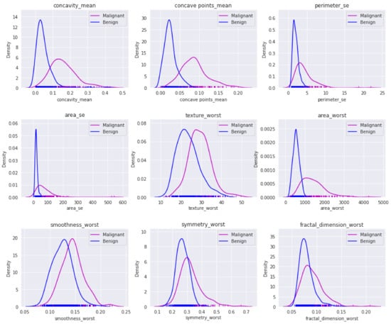 The nine attributes: concavity-mean, concave points-mean, perimeter-se, area-se, texture-worst, area-worst, smoothness-worst, symmetry-worst, and fractal-dimension-worst were provided by a wrapper feature selection method. Performance results of machine learning classifiers with reduced numbers of features from the initial set are shown in Table 4. Kernel density estimation (KDE) plots were used to check the distribution of malignant and benign cases for selected features. The visualization of the above-mentioned features is shown in Figure 6