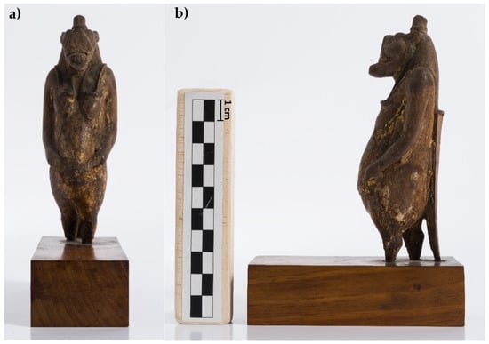 The analyzed Taweret statuette (Cat. 528), frontal (a) and lateral (b) views, before the conservation treatment.