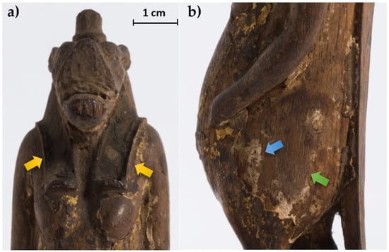 Some details of the statuette: (a) face and notches for the wig (yellow arrows); (b) detail of the body where the wood material (green arrow) and the preparation layer (blue arrow) are visible.