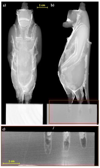 Radiographs of the statuette, (a) frontal and (b) lateral view; (c) detail of the legs and tail insertion in the modern base.