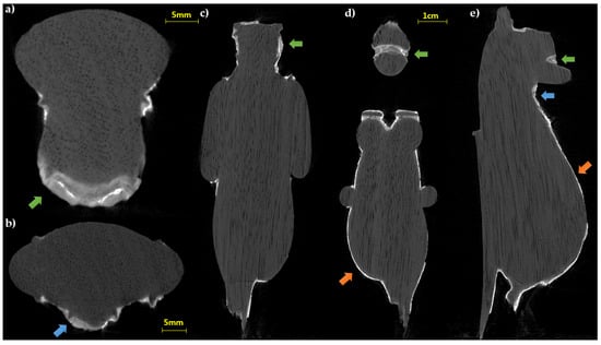 CT slices of the statuette: (a,b) horizontal sections; (c–e) longitudinal slices. In all the sections the wood structure (vessels and growing rings) is visible (green arrows: preparation layer in the face area; blue arrows: fractures inside the preparation layer; orange arrows: thin preparation material for the gold leaf adhesion).