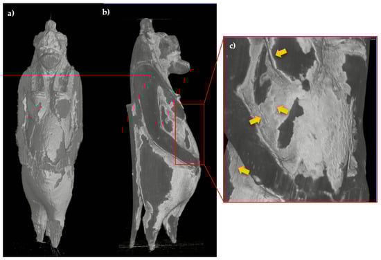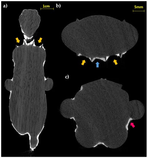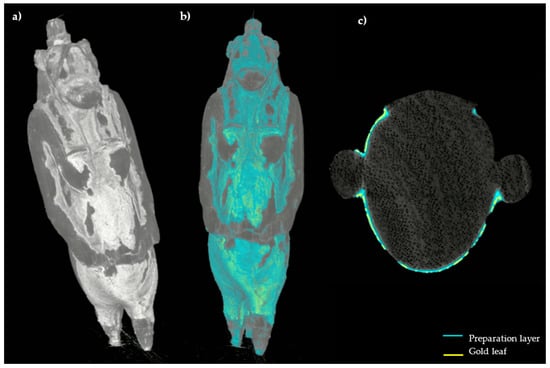 The slices corresponding to the body confirm a rather homogeneous distribution and thin thickness of the preparatory layer (Figure 7a), confirming, in this case, the application of this material for the metal leaf adhesion and not for modeling the object. Only in correspondence with limited notch defects, does the layer have a shape corrective function. Additionally, the tomographic analysis of the terminal portions (legs and tail) allows verifying the presence of the decoration even in correspondence with the less visible portions and between the legs (Figure 7b).
