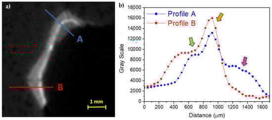 The thicknesses of the preparation layer in those areas, beneath the gilding, can be observed in the horizontal slices of the CT scan (Figure 4). Especially in some areas, the preparatory layer is of great thickness, such as, for example, in correspondence of the truncated muzzle for which a more conspicuous modeling intervention is therefore hypothesized. In some places, it is also possible to observe micro-fractures inside the preparation layer itself (Figure 4b,e). On the surface, it is possible to visualize limited areas with high radiopacity, above the preparation, presumably identifiable with the applied gold leaf, and in some places, with another layer of lower radiopacity material placed above (similar to that of the preparatory layer, but slightly less radiopaque), attributable to a blackish-brown material visible to the naked eye (partially composed of a protein substance and a fat substance or natural resin, with a heterogeneous deposit of calcium carbonate, gypsum, and silicates, detected by Infrared Spectroscopy (FT-IR) analysis, Figure 5c). In Figure 6, an enlargement of Figure 5c and the profile plots in two regions of interest are shown. It is possible to better observe the different thicknesses of the preparation layers in the two parts of the object (thicker in part B than in part A), the peak due to the gold layer, and the contribution of the blackish-brown material (present only in part A).