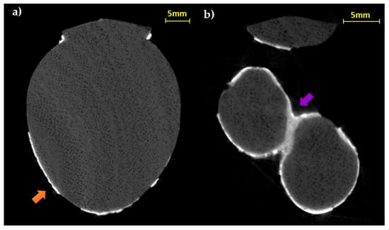 CT horizontal slices of the body (a) and the legs (b) (orange arrow: thin preparation material for the gold leaf adhesion; purple arrow: thick preparation material between the legs).