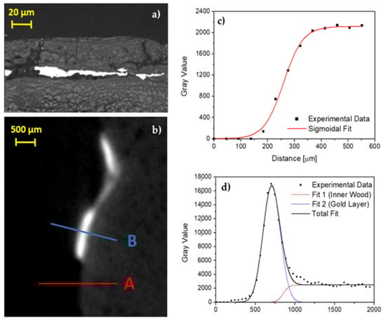 (a) Backscattering image by means of SEM, the gold layer is in light gray; (b) enlargement of Figure 5c; (c) profile plot along A line shown in (b), only wood; (d) profile plot along B line shown in (b), gold on thin preparation layer.