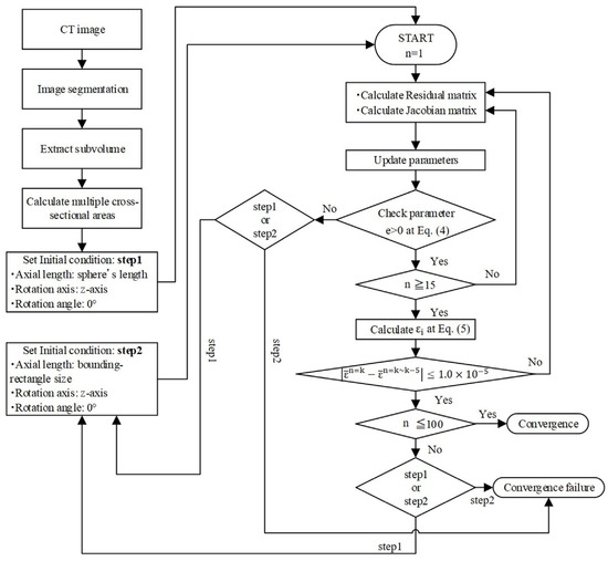Figure 2 shows the evaluation procedure. First, the cross-sectional areas of a particle are calculated on segmented images. In this study, the cross-sectional areas are calculated at increments of 15° for θ and ϕ (0 ≤ θ, ϕ ≤ 180°). In total, 132 cross-sectional areas were calculated for each particle. Next, the initial values for the particle length are set to the spherical equivalent diameter, the rotation axis of the Z-axis, and the rotation angle of 0°, and the parameters are updated using the Gauss–Newton method. Then, the error of the cross-sectional area ( as shown in Equation (5)) between the particle and the ellipsoid is calculated. The convergence of iteration is judged by calculating the average of for a particle, i.e., the iterative loop was broken if the difference was less than 10−5 between (which is the average of at the present iteration) and (which is the average of for the five iterations prior to the present iteration).