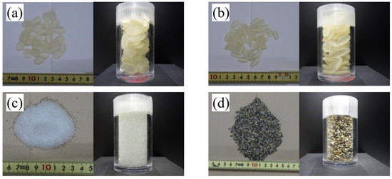 Acrylic glass columns filled with the materials: (a) RP1 and (b) RP2 (resin particles made by a 3D printer), (c) GBs (glass beads), and (d) KS (Kashima–Keisa natural sand).