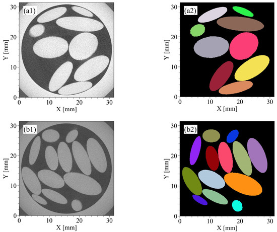 Figure 4(a2–d2) shows segmented images for the horizontal plane of the four materials. In the case of RP1 and RP2 (Figure 4(a2,b2)), the segmentation was performed with good accuracy. In the case of GBs and KS (Figure 4(c2,d2)), there were some particles where either multiple particles were extracted as one particle or one particle was extracted as multiple particles but the segmentation was generally successfully performed. As a result of image segmentation, the number of particles was 46 for RP1; 76 for RP2; 47,634 for GBs; and 3381 for KS.