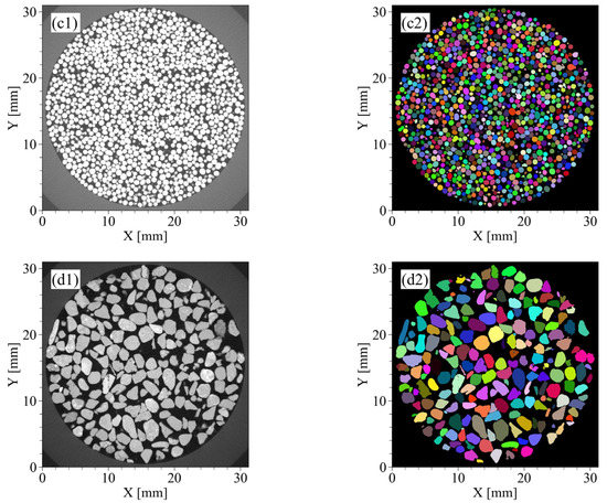 Figure 4(a1–d1) shows CT images for the horizontal plane of four materials. The voxel size in Figure 4(a1,b1) is 45 μm/voxel and the image size is 930 × 930 × 1360 voxels. The voxel size in Figure 4(c1,d1) is 25 μm/voxels and the image size is 1560 × 1560 × 1360 voxels. The materials of RP1, RP2, and the GBs have smooth surfaces and simple shapes, such as spheres or ellipsoid, by direct observation of the CT images (Figure 4(a1–c1)). On the other hand, the materials of KS indicated angularity (Figure 4(d1)) with KS being natural sand.