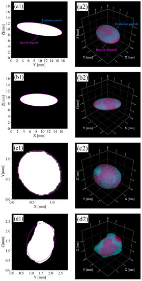 In this study, the particles with a length of less than 10 voxels with respect to the X-, Y-, and Z-axes (measured using a bounding box) were not subjected to the ellipsoid fitting. This is because preliminary investigations have shown that if the number of voxels representing the particles is not sufficient, the cross-sectional area cannot be calculated accurately and in turn decreasing the accuracy of the ellipsoid fitting.