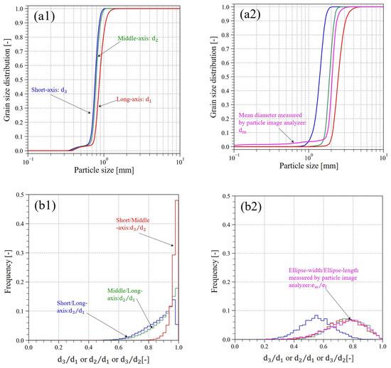 Evaluation results of particle shape. (a1,a2) are the cumulative ratio curve of , , , and (only for KS). (b1,b2) are the histograms of , , , and (only for KS). (c1,c2) are Zingg diagrams. The left columns are evaluation results of the GBs, and the right columns for KS. GBs, glass beads; KS, Kashima–Keisa natural sand.