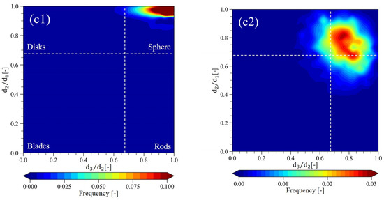 Figure 6(c1,c2) shows the histogram contour plot with on the vertical axis and on the horizontal axis. In these figures, the value of and at 2/3 (0.67) is taken as the boundary value, and the particles are classified into spheres, rods, disks, and blades. As shown in Figure 6(c1), almost all particles in the GBs were classified as spheres. On the other hand, most of the particles in KS were also classified as spheres, but some particles were classified as disks or rods, with much more variation compared to the GBs (Figure 6(c2)). This indicates that KS is natural sand, composed of soil particles of various shapes.