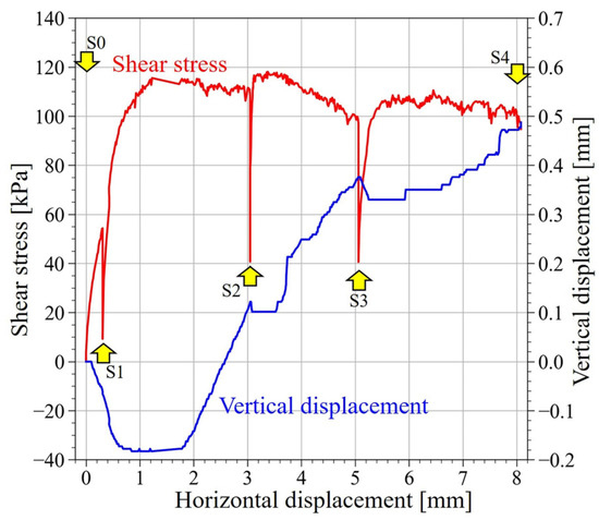 Experimental results of direct shear experiment. CT scanning was performed when horizontal displacement was 0.0 (S0), 0.3 (S1), 3.0 (S2), 5.0 (S3), and 8.0 mm (S4).