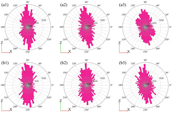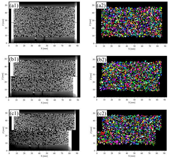 Figure 8(a1–c1) shows the CT images at S0 (initial state), S2 (Dh = 3 mm), and S4 (Dh = 8 mm). The voxel size was 91 μm/voxel, and the image size was 1024 × 1024 × 600 voxels. In this experiment, the shear stress reached its peak when Dh reached ~1.3 mm, so the images after S2 are the CT images during the strain softening process. In S0 (Figure 8(a1)), the voids appeared to be homogeneous over the sample, but after S2 (Figure 8(b1,c1)), the voids near the shear plane increased.