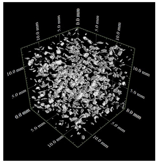 Four types of materials were filled into each acrylic glass column on a horizontal desk. The materials were not compacted, and the acrylic glass column had an internal diameter of 30 mm and a height of 60 mm, as shown in Figure 3. After CT scanning of the acrylic glass column using a micro-focus X-ray CT scanner (TXS-CT 450/160; Tesco, Yokohama, Japan), which was installed at the Central Research Institute of the Electric Power Industry in Japan, image segmentation was conducted. The TXS-CT 450/160 was equipped with two kinds of X-ray sources (450 kV and 160 kV sources). In this CT scanning, 160 kV source (maximum voltage is 160 kV) was used. Next, , , and were evaluated for all particles using the proposed ellipsoid fitting method. Finally, the shape parameters of , , , and were calculated for each particle, where , , and indicate the aspect ratio, slenderness ratio, and flatness ratio, respectively, and indicates Krumbein’s sphericity [38] calculated using Equation (6).