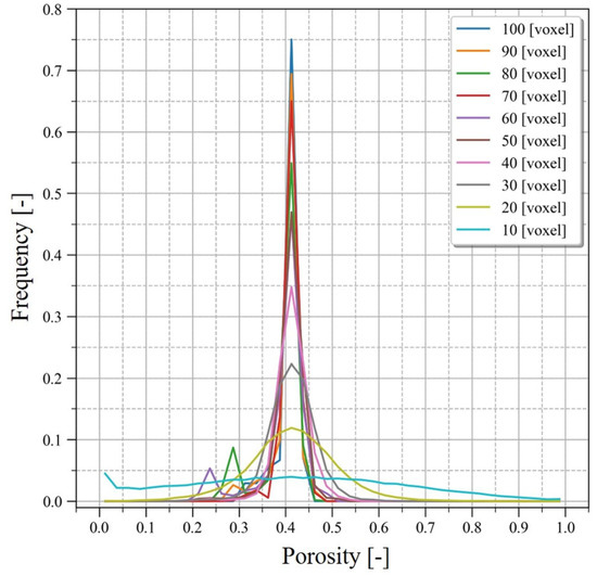 A grid size of 10 voxels was not adequate since some grids had zero porosity; i.e., only particles occupied the grid. When the grid size was larger than 10 voxels, the peak was observed when porosity was between 0.40 and 0.45. When the grid size exceeded 40 voxels, only the peaks became higher while the shape of the bottom part of the histogram remained approximately the same. This means that there was no change in the porosity distribution even when the grid size was further increased. Based on the results, the grid size was set to 40 voxels (3.64 mm) in consideration of the image resolution.