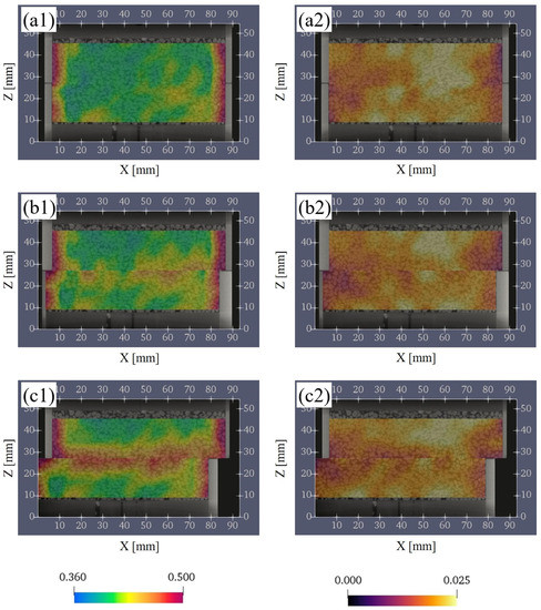 Evaluation results of the porosity and the ratio of contact-surface between particles on the vertical plane (XZ plane). (a1,a2) are the results at S0 (initial sate). (b1,b2) are the results at S2 (Dh = 3.0 mm). (c1,c2) are the results at S4 (Dh = 8.0 mm). Dh, horizontal displacement. The left columns are the porosity, and the right columns are the ratio of contact-surface between particles.