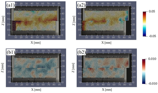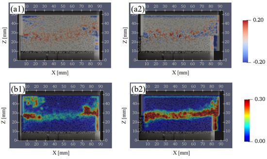 Change in the porosity and the ratio of contact surface between particles on the vertical plane (XZ plane). (a1,a2) show the change in the porosity. (b1,b2) show the change in the ratio of contact surface between particles. The left columns represent the change between S1 (Dh = 0.3 mm) and S2 (Dh = 3 mm), and the right columns represent the change between S3 (Dh = 5 mm) and S4 (Dh = 8 mm). Dh, horizontal displacement.