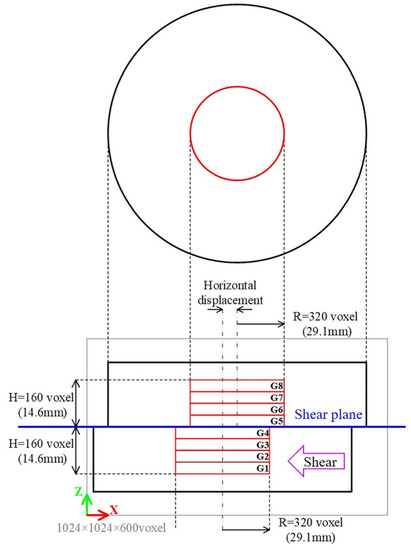 DIC analysis is an image analysis method that evaluates the displacement field over the full field of a material by comparing two images [21,41]. The displacement is calculated from the correlation of 3D subsets of the reference and deformed volumetric images. From the displacement evaluation, the strain distribution can be obtained according to the displacement. DIC analysis was performed on CT images of direct shear experiments to obtain the volume strain distributions and shear strain distributions in 3D space using Tomowarp, an analysis code that can evaluate the displacement and strain between 3D images [21]. When the calculation of the correlation, the interval of the nodal point was set to 10 voxels in the X-, Y-, and Z-directions.