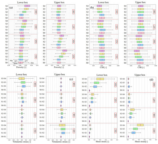 In this section, the change of the porosity and CSR were calculated between before and after each shear displacement. Figure 12(a1,b1) shows the calculation results of subtracting S1 from S2 and Figure 12(a2,b2) shows the calculation results of subtracting S4 from S3 about the porosity and CSR. Both results were calculated by considering the displacement of the lower box and depended on the position of the box.