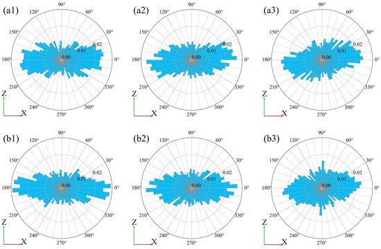 The proposed method was performed to fit the ellipsoid as well as evaluate the particle length and direction of the long-, middle-, and short-axes for each particle on the CT images of the direct shear experiment. After calculating the intersection points between the long-, middle-, and short-axes of the best-fit ellipsoid, and for the upper and lower hemispheres of the unit sphere centered on the center of gravity of the best-fit ellipsoid, the intersection points were projected onto the horizontal (XY) and vertical (XZ) planes, and the frequency was calculated every 10°. The results of the calculation are summarized as a circular histogram using a rose diagram. Furthermore, to examine the change in particle direction with time, the histogram was divided into four regions (337.5–22.5° and 157.5–202.5°; 22.5–67.5° and 202.5–247.5°; 67.5–112.5° and 247.5–292.5°; 112.5–157.5° and 292.5–337.5°), and the frequencies were integrated in each region at each step.