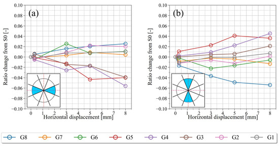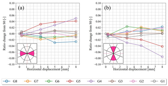 As strain softening progressed (S4, Dh = 8 mm), the minimum volumetric strain decreased further, and the maximum volumetric strain also increased further. However, the average volumetric strain approached zero and the state reached equilibrium (or steady state). In contrast, according to the change of particle direction with time, the change of particle direction became sharper after S3 (Dh = 5 mm) when the volume expansion inside the shear zone exceeded the peak. Finally, the ratio of horizontally directed long axes of the particles decreased by ~6%, and the ratio of vertically directed short axes of the particles decreased by a maximum of ~8%. In addition, the ratio of vertical long axes of the particles increased by ~4%, as well as the ratio of the horizontal short axes of the particles increasing by ~4%. These changes in the soil structure were not observed in the region away from the shear plane, which is considered to be a characteristic of the soil structure near the shear plane.