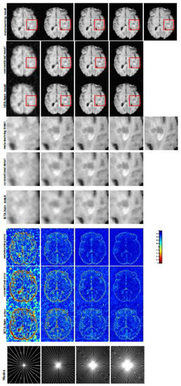 - Haldar, J.P.; Hernando, D.; Liang, Z.P. Compressed-sensing MRI with random encoding. IEEE Trans. Med Imaging 2010, 30, 893–903. [Google Scholar] [CrossRef] [Green Version]