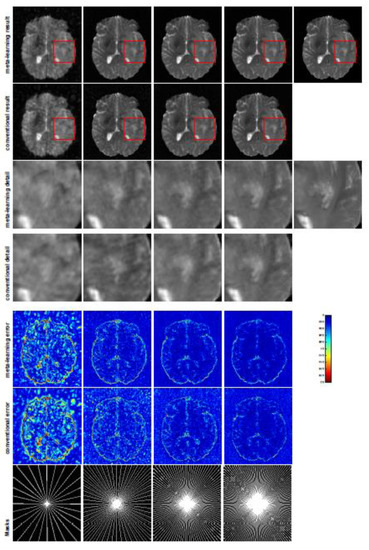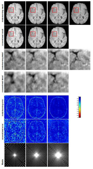 We made comparisons between meta-learning and the conventional network on the seven different CS ratios (10%, 20%, 30%, 40%, 15%, 25%, and 35%) in terms of two types of random under-sampling patterns: radial sampling mask and Cartesian sampling mask. The parameters for both meta-learning and conventional learning networks were trained via the Adam optimizer [59], and they both learned the forward unrolled task-invariant parameter . The network training of the conventional method used the same network configuration as the meta-learning network in terms of the number of convolutions, depth and size of CNN kernels, phase numbers and parameter initializer, etc. The major difference in the training process between these two methods is that meta-learning is performed for multi-tasks by leveraging the task-specific parameter learned from Algorithm 2, and the common features among tasks are learned from the feed-forward network that unrolls Algorithm 1, while conventional learning solves the task-specific problem by simply unrolling the forward network via Algorithm 1, where both training and testing are implemented on the same task. To investigate the generalizability of meta-learning, we tested the well-trained meta-learning model on MR images in different distributions in terms of two types of sampling masks with various trajectories. The training and testing of conventional learning were applied with the same CS ratios; that is, if the conventional method was trained with a CS ratio 10%, then it was also tested on a dataset with a CS ratio of 10%, etc.