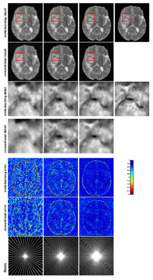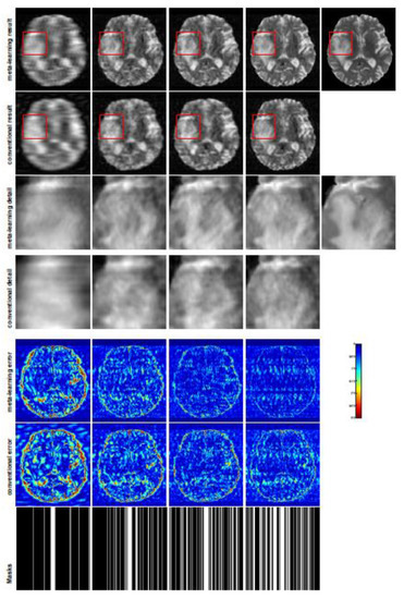 In general supervised learning, training data need to be in the same or a similar distribution; heterogeneous data exhibit different structural variations of features, which hinder CNNs from extracting features efficiently. In our experiments, raw measurements sampled from different ratios of compressed sensing display different levels of incompleteness; these undersampled measurements do not fall in the same distribution but they are related. Different sampling masks are shown at the bottom of Figure 1 and Figure 3, and these may have complemented sampled points, in the sense that some of the points which a sampling ratio mask did not sample were captured by other masks. In our experiment, different sampling masks provided their own information from their sampled points, meaning that four reconstruction tasks helped each other to achieve an efficient performance. Therefore, this explains why meta-learning is still superior to conventional learning when the sampling ratio is large.