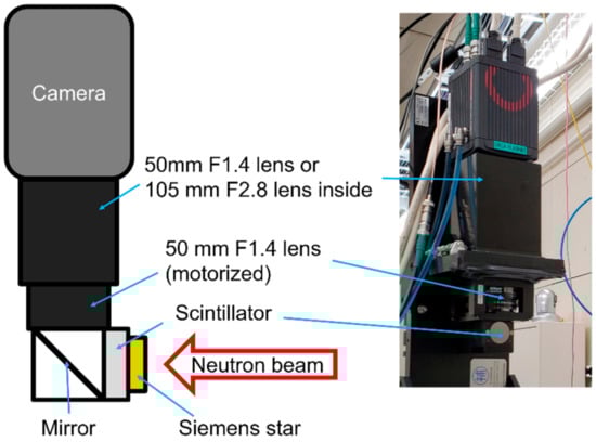 Experiments were performed at the energy-resolved neutron-imaging system RADEN, which was installed at beamline number 22 (BL22) in the Materials and Life Science Experimental Facility (MLF) of the Japan Proton Accelerator Research Complex (J-PARC) []. This instrument is equipped with several neutron detectors and have achieved a minimum spatial resolution of 30 μm using a 6LiF/ZnS scintillator and a cooled Charge Coupled Device (CCD) camera. For this study, we newly prepared an imaging system, which was originally designed for X-ray imaging with a spatial resolution of less than 10 µm. A schematic of the imaging system is shown in Figure 1. This system consisted of a Complementary Metal–Oxide–Semiconductor (CMOS) camera, two optical lenses, a mirror, and a scintillator. The CMOS camera is an ORCA-Flash4.0 V3 of Hamamatsu Photonics K.K. (Hamamatsu, Japan) with 2048 × 2048 pixels of 6.5 μm square sensors. The two lenses composed an infinity-corrected optical system [,]. The primary lens was 50 mm F1.4 from Nikon (Tokyo, Japan), and, for the secondary lens, we used a 50 mm F1.4 lens and a 105 mm F2.8 lens, both from Nikon, to change the image magnification to 1.0 and 2.1, respectively. These lens conditions are referred to as the “1×” and “2×” conditions hereafter. The fields of view (FoV) are 13.3 mm square and 6.6 mm square, respectively. Two GAGG scintillators, which were commercial products for X-ray imaging, with thicknesses of 10 and 100 µm, were adopted in the experiment, and a P43 with 10 µm thickness was also used for comparison. The diameter of the GAGG scintillator was 15 mm and it was supported by a 1 mm-thick amorphous carbon backplate, while that of the P43 screen was 16 mm, whose substrate was a 0.5 mm-thick beryllium plate. All scintillators were purchased from Hamamatsu Photonics K.K. A Siemens star target made of Gd thin film evaporated onto a quartz substrate from PSI, whose inner line pair was 20 μm wide and whose outer was 500 μm wide [], was used to evaluate the spatial resolution performance. This target was directly attached to a support plate of a scintillator to minimize geometrical blurring.