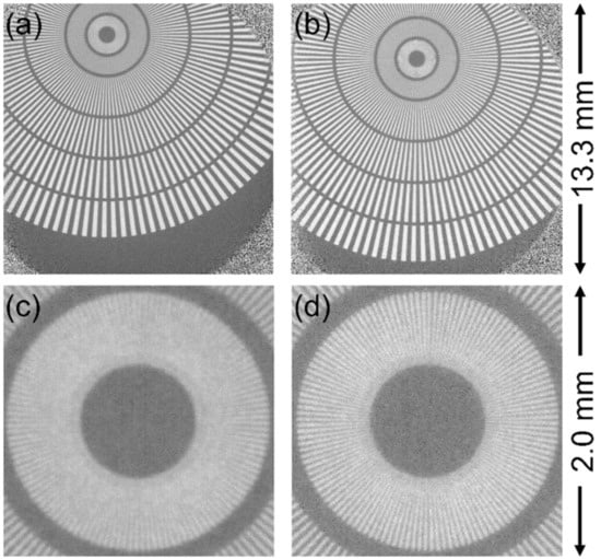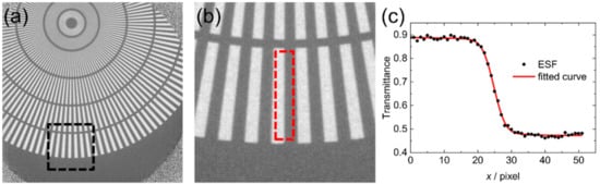 As shown in Figure 2a, in order to average over a sufficiently large area, ESFs were obtained from the outer shell of the Siemens star. Then, the resolutions were calculated from the fitting parameters of ESFs by the method in this section.