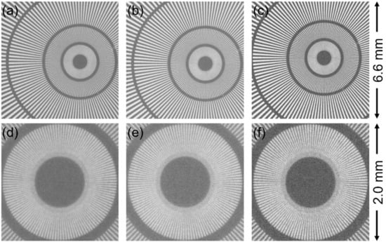 Next, the 2× experiments using the 105 mm F2.8 lens for the secondary lens were conducted. The entire FoV was within the effective area of scintillators in this condition. According to the results of the 1× condition that the GAGG scintillator was confirmed to produce enough light by neutrons, we also employed a 10-µm-thick GAGG scintillator anticipating a higher spatial resolution than the 100-µm-thick one in addition to the scintillators used in the former experiments. Figure 4 shows the neutron transmission images at L/D = 300 in the 2× condition for three scintillators. The 10-μm-wide lines in the center of the Siemens star pattern were successfully distinguished by using all scintillators. The image taken with the GAGG (100 μm), shown in Figure 4b,e, appeared as clear as that taken with the P43 scintillator (Figure 4a,d), similar to the results of the 1× condition. By using the 10-µm-thick GAGG scintillator, which should cause the lowest photon scattering and attenuation, the contrast of the image appeared to be further enhanced, as seen in Figure 4c,f. Actually, the Michelson contrast of P43, 100-µm-thick GAGG, and 10-µm-thick GAGG was calculated to be 45%, 44%, and 57%, respectively.