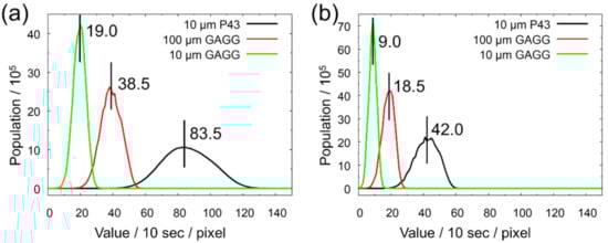Histograms of open-beam intensity taken at 2× magnification with scintillators P43 (10 μm), GAGG (100 μm), and GAGG (10 μm): (a) L/D = 180 and (b) L/D = 300. The position and value of the median are shown in the figure.