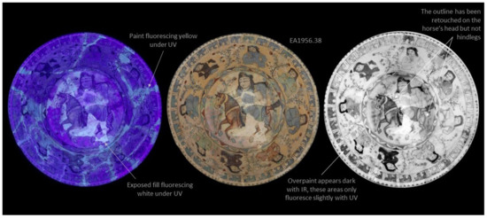 6]. No significant change in the appearance of the black paint used in restorations on Mina’i objects in this study was observed in UV or IR images. The lack of response from the black paint systems used in restorations is problematic because inscriptions and outlines in the iconography are painted in this colour. We can clearly see that some of these decorative elements sit on top of fills, but the extent of the black retouching remains obscure in most of the images.